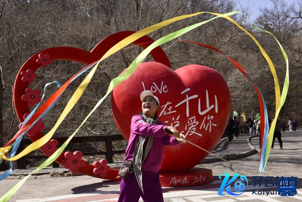 3月21日,别称旅客在千山景区摆动彩带拍照迷恋。