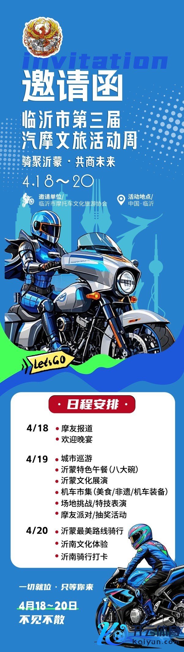 为合手续擦亮“前锋临沂 活力罗庄”品牌,助力文旅交融发展,打造寰宇汽车与摩托车文旅产业平台,4月18日至20日,山东省临沂市将举办“骑聚沂蒙·共商明天”2025临沂市第三届汽摩文旅活动周开云体育,邀请寰宇千余名摩友降临骑行,共商发展大计。