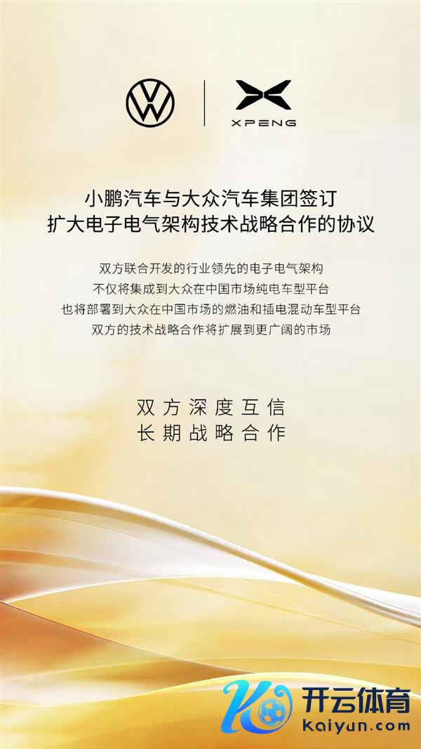 小鹏汽车董事长 CEO 何小鹏关于这次互助暗意:"本次扩大互助契约是继 2024 年 7 月 22 日签署鸠合树立契约之后,两边互助过程中的又一首要里程碑。此举不仅印证了两边长久策略互助伙伴磋磨的深度互信,更彰显了两边在智能电动汽车中枢时刻界限握续时刻更变、共同创造价值的顽强决心与前瞻视线。"