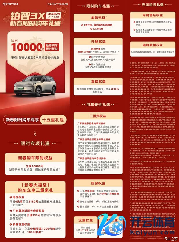 [汽车之家 资讯] 日前,广汽丰田铂智3X(参数|询价)推新春限时购车礼遇,2月17日-28日购车可享1万元限时权柄(通过尾款立减);新春大福袋包括电桩权柄、厂家尊享版干事套餐权柄和新春盲盒权柄;另外还有金融权柄、升舱权柄和置换权柄等。