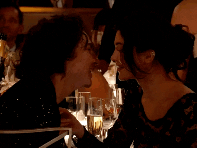 甜茶坐在沙发椅上,凯莉轻轻坐在他的腿上,双手环住他的肩膀,迅速地舌吻了一下,动作走位访佛音乐节那次