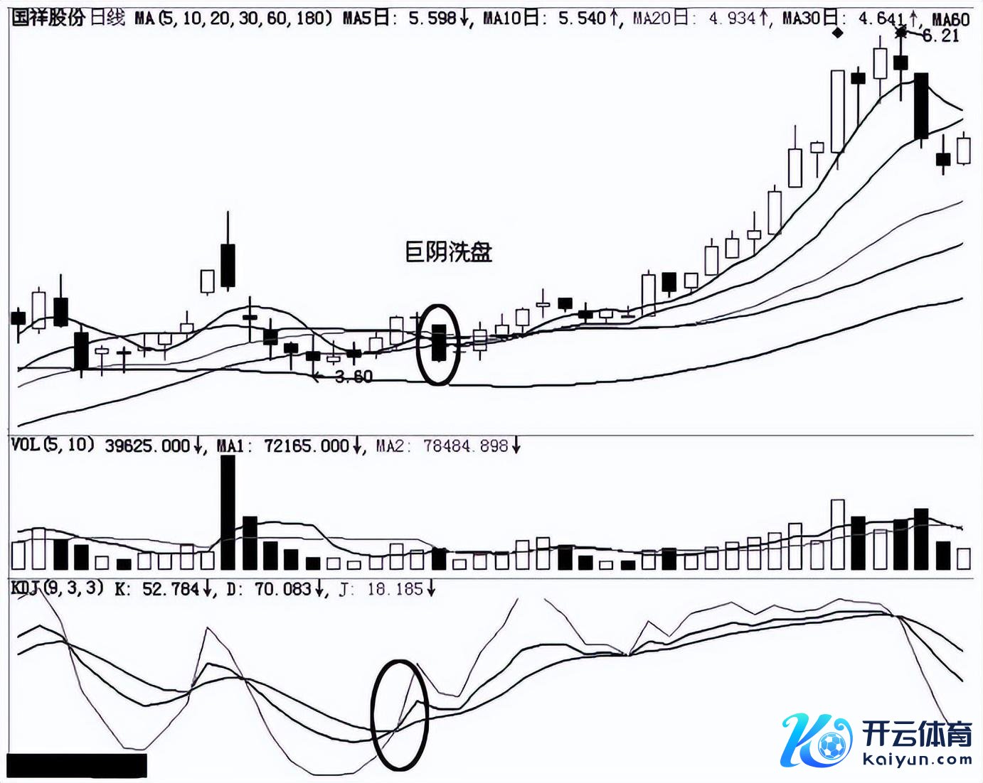 如图2-2所示为国祥股份(600340)走势图,在讯息面坦然的情况下蓦然杀出一根巨阴,全天跌幅7.65%,且跌穿5日线、10日线、20日线和30日线,花式上似乎如故恶化。仔细分析一下该股,熊市中该股跌幅较大,最低探至2.45元(还权价钱),曾有一定的涨幅,庄家尚处在拉升初期,不存在出货的可能,很可能借此清洗浮筹,为日后进一步拉升沉静压力。该股在KDJ已酿成金叉,巨阴之后KDJ金叉并未结巴,且进过了一段整理阶段缩量昭彰,巨阴之后又快速站上均线系统,由此不错判断庄家巨阴为洗盘,待股价再行站上10日线后,便运行了后续一段时分的大幅上升行情。