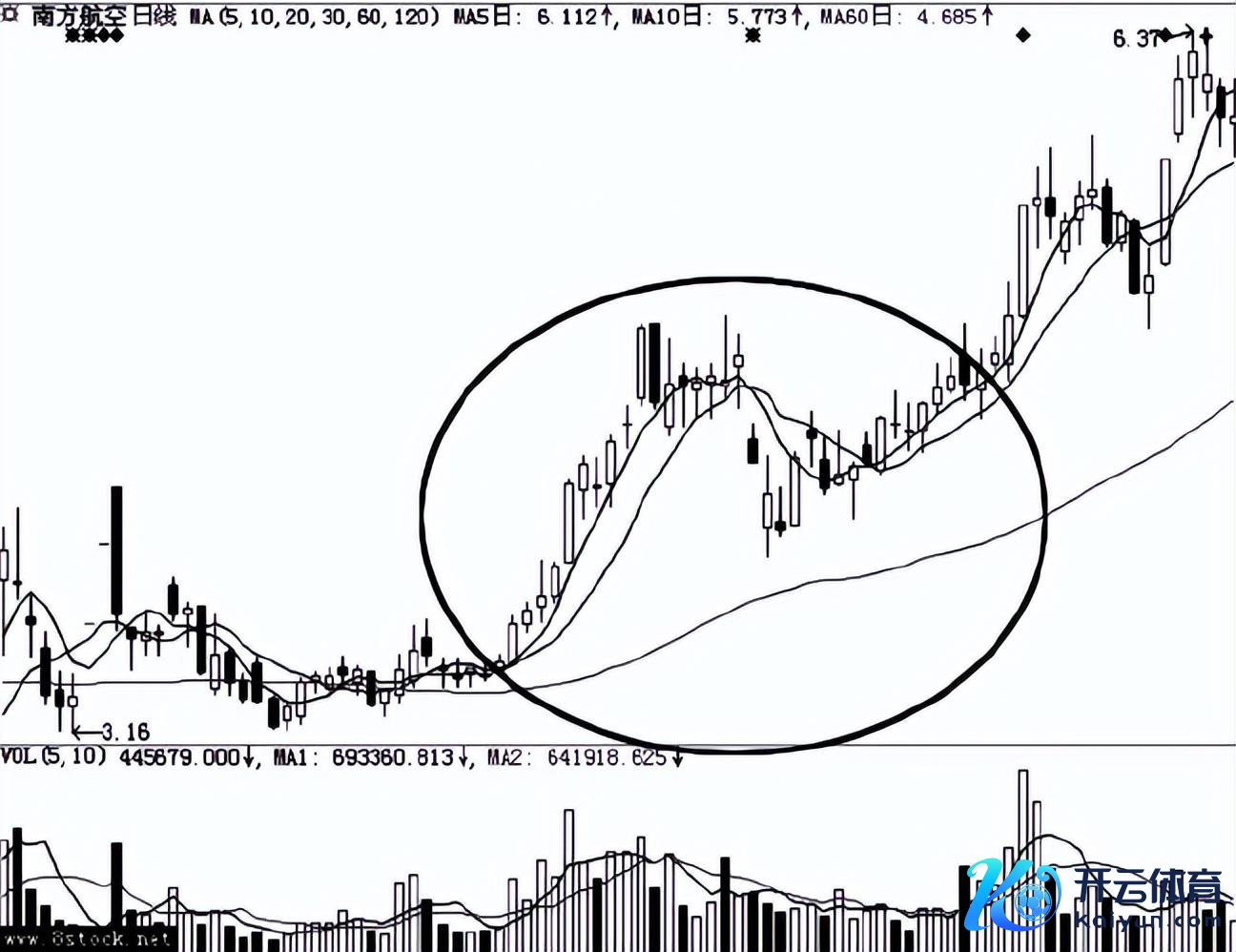 (2)第二个介入点:在鸭嘴部隔邻成交量呈芝麻点一带逢低买入。这个介入点有一定的意旨,缩量下落洗盘,不错相宜介入。但此时风险照旧较大,若是此时短线均线曾空头胪列,不绝下落的可能性不小。尤其是在熊市之中,风险更大,最好的介入点是在量能放大打破之时。