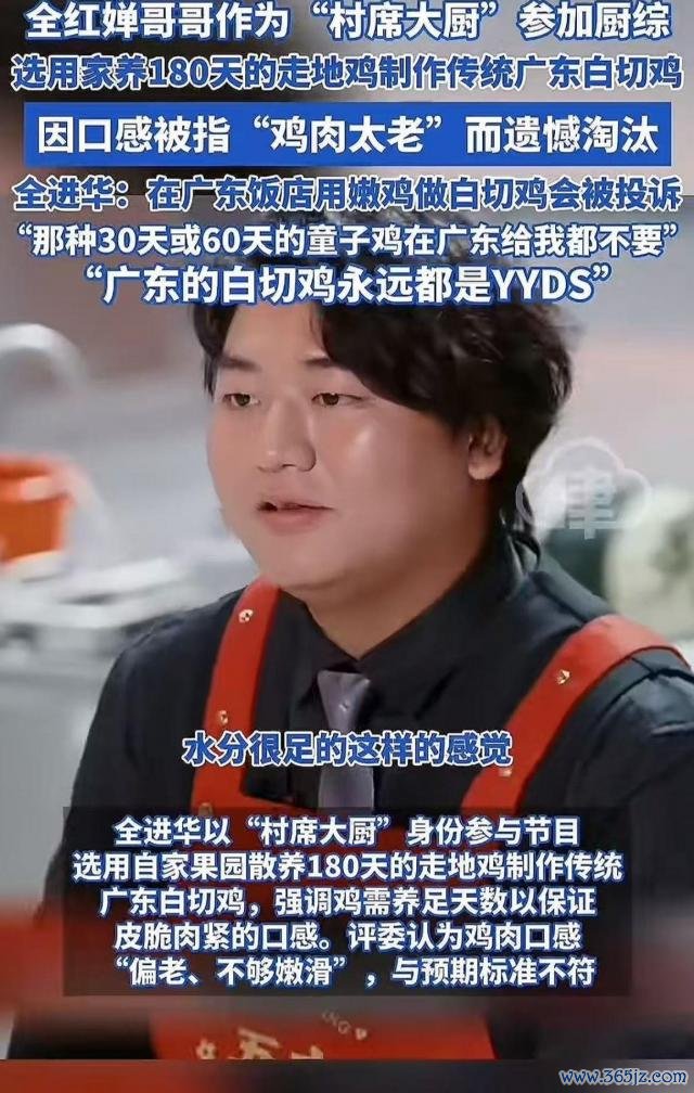 近日,全红婵哥哥全进华在过问厨艺综艺时,采用自家衍生的 180 天走地鸡制作白切鸡,评委以"肉质偏老"为由将其淘汰。