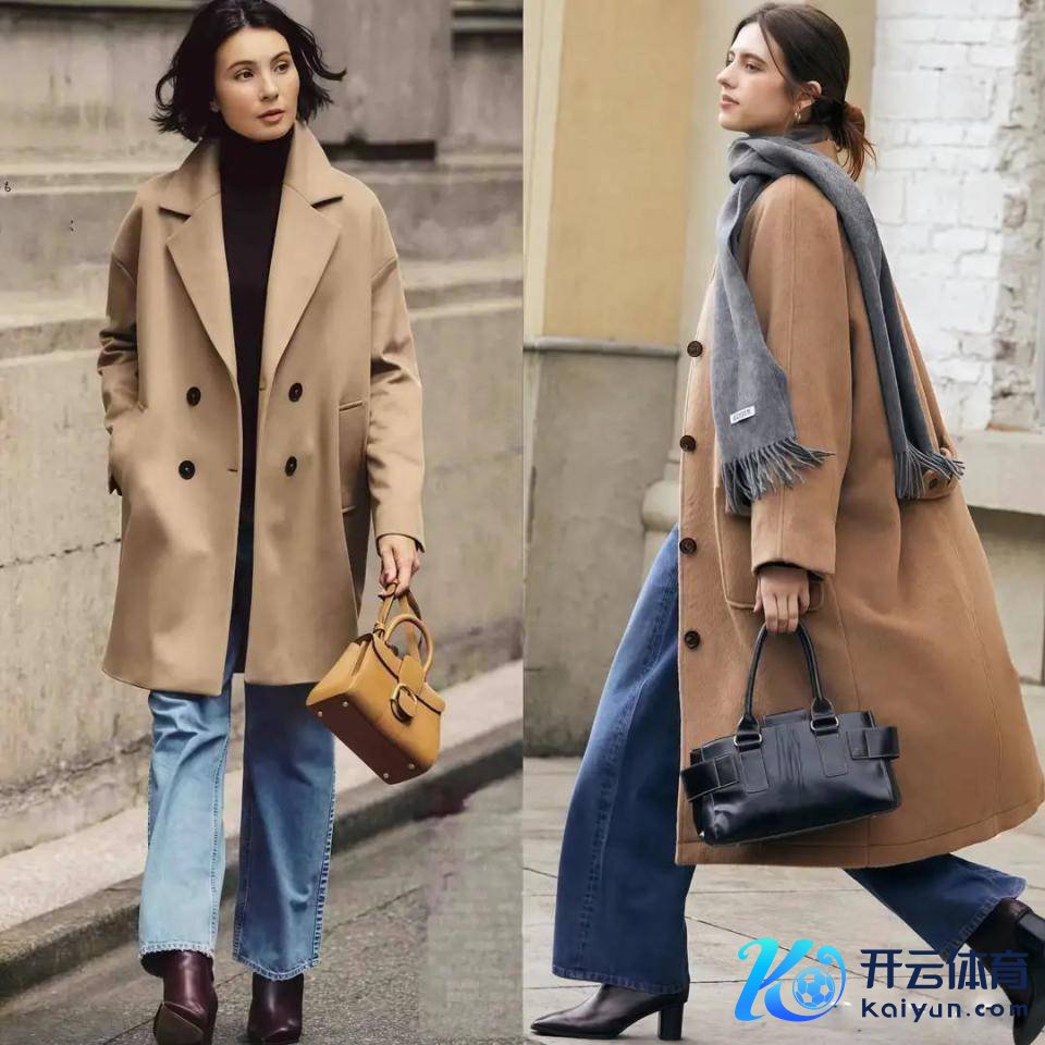 举例底下用一件玄色大衣搭配上一条驼色西装阔腿裤,加上一款驼色的领巾和同色系的手提包,就能打造出高等好意思丽的造型。