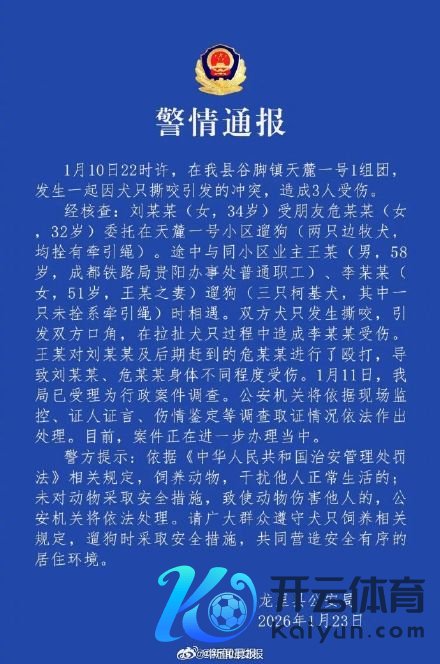 1月23日,贵州龙里县公安局发布通报:1月10日22时许,在我县谷脚镇天麓一号1组团,发生一缘故犬只撕咬激勉的打破,变成3东说念主受伤。 经核查:刘某某(女体育游戏app平台,34岁)受一又友危某某(女,32岁)委派在天麓一号小区遛狗(两只边牧犬,均栓有牵引绳)。途中与同小区业主王某(男,58岁,成王人铁路局贵阳做事处等闲员工),李某某(女,51岁,王某之妻)遛狗(三只柯基犬,其中一只未栓系牵引绳)时相逢。两边犬只发生撕咬,激勉两边辱骂。在拉扯犬只历程中变成李某某受伤。王某对刘某某及后期赶到的危某某进行了殴打,导致刘某某、危某某体格不同进程受伤。1月11日,我局已受理为行政案件看望。公安机关将依据现场监控、证东说念主证言、伤情武断等看望取证情况照章作出处理。当今,案件正在进一步办理应中。